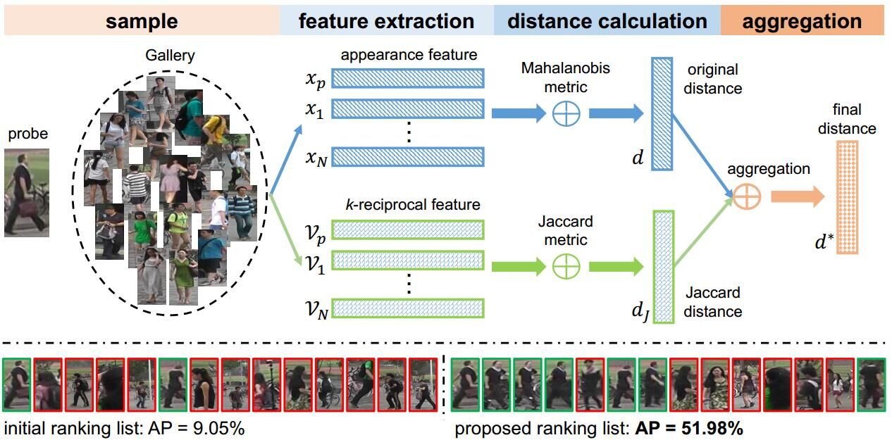 When considering person re-identification (re-ID) as a retrieval process, re-ranking is a critical step to improve its accuracy. Yet in the re-ID community, limited effort has been devoted to re-ranking, especially those fully automatic, unsupervised solutions. In this paper, we propose a k-reciprocal encoding method to re-rank the re-ID results. Our hypothesis is that if a gallery image is similar to the probe in the k-reciprocal nearest neighbors, it is more likely to be a true match. Specifically, given an image, a k-reciprocal feature is calculated by encoding its k-reciprocal nearest neighbors into a single vector, which is used for re-ranking under the Jaccard distance. The final distance is computed as the combination of the original distance and the Jaccard distance. Our re-ranking method does not require any human interaction or any labeled data, so it is applicable to large-scale datasets. Experiments on the large-scale Market-1501, CUHK03, MARS, and PRW datasets confirm the effectiveness of our method. Code is available at: https://github.com/ zhunzhong07/person-re-ranking.