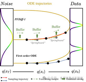 简介: 本文提出了一种名为PFDiff的无需训练的加速采样方法,旨在提升扩散模型(DPMs)的采样效率。PFDiff通过结合过去和未来的分数(scores),提出一种新颖的时间步跳过策略,显著减少了采样过程中所需的函数评估次数(NFE),同时纠正了一阶常微分方程(ODE)求解器的离散化误差。具体而言,PFDiff首先利用过去时间步的分数预测一个“跳板”状态,然后通过前瞻性更新机制利用未来分数快速更新当前中间状态,从而实现高效的采样加速。大量实验表明,PFDiff在多种预训练的扩散模型上表现出色,尤其在条件扩散模型中,以DDIM为基线时,PFDiff在4个NFE下在ImageNet 64×64数据集上将FID从138.81降低至16.46,显著提升了样本质量,展现出超越以往最先进无需训练方法的效果。此外,PFDiff无需额外训练,且与现有扩散模型采样算法正交,在提升扩散模型采样效率方面展现出广阔的应用前景。